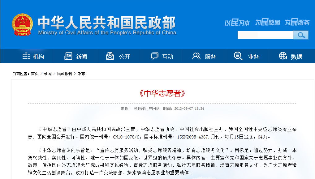 《中华志愿者》由中华人民共和国民政部主管,中华志愿者协会、中国社会出版社主办,我国全国性中央级志愿类专业杂志,面向全国公开发行。国内统一刊号:CN10-1078/C,国际标准刊号:1SSN2095-4387.月刊,每月15日出版,64页。
