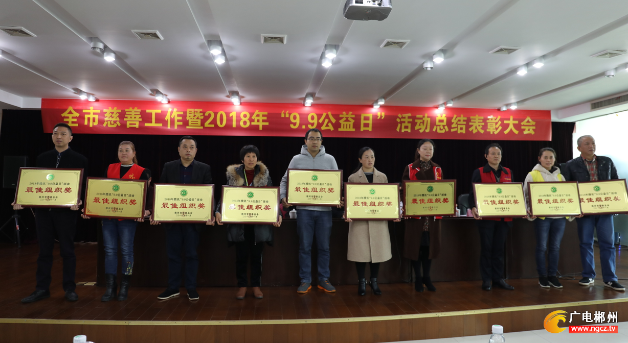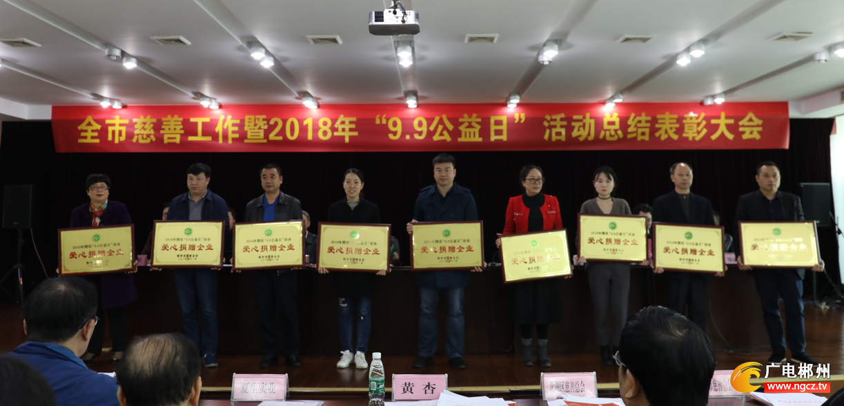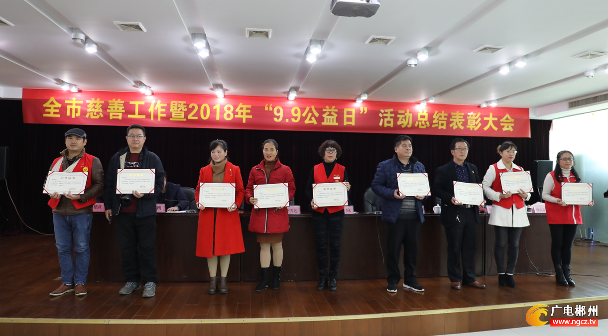 在腾讯“9·9”公益日活动中,爱心企业、社会爱心人士慷慨配捐,志愿者协会、项目合作单位积极配合,新闻媒体主动宣传,积极参与腾讯“9·9”公益日活动,为表彰先进,弘扬社会正能量,鼓励社会各方爱心力量参与慈善公益事业,助力扶贫攻坚,市慈善总会对郴州市肾康神兵专科医院有限公司等40家踊跃参与配捐的企业,授予“2018年腾讯99公益日活动爱心捐赠企业”荣誉称号;对郴州市益行志愿者协会等10家单位授予“2018年腾讯99公益日活动最佳组织奖”荣誉称号;对李宣霖等36位个人授予“2018年腾讯99公益日活动最佳劝募奖”荣誉称号;对袁勇杰等4名记者授予“2018年腾讯99公益日活动宣传工作先进个人”荣誉称号,并进行了颁奖。