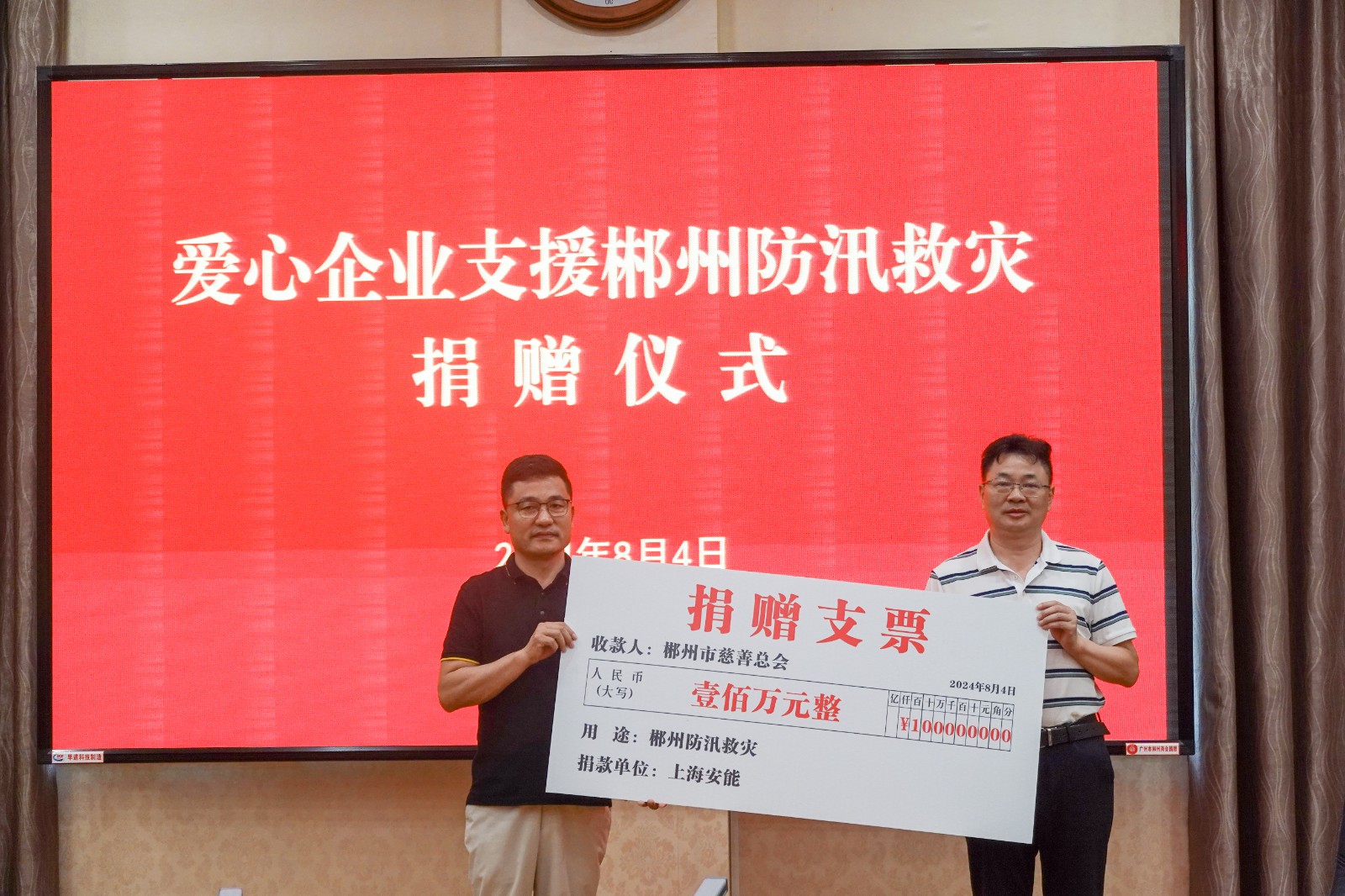 8月4日,上海安能工建矿业集团有限公司、湖南绿叶水果有限公司、中国人寿财产保险股份有限公司郴州市中心支公司、郴州湘林环保餐具消毒有限公司等向市慈善总会捐赠善款127万元。其中,上海安能工建矿业集团有限公司董事长齐海林代表该公司捐赠100万元。