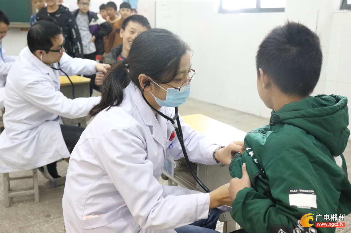 郴州市第一人民医院(北院)儿童医院医生正在为宜章县思源实验学校的学生做检查。
