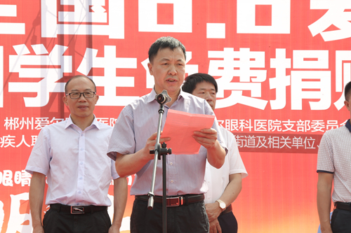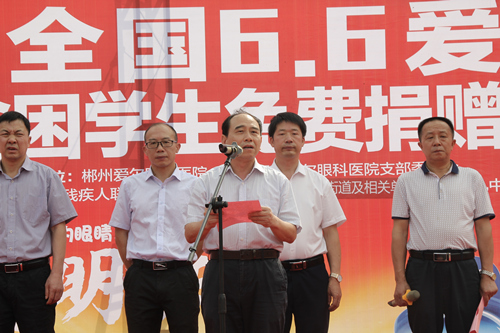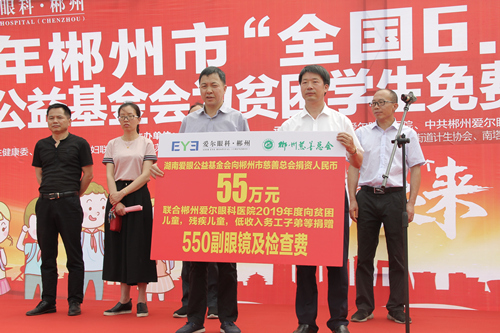 市慈善办主任喻应志主持,市慈善总会副会长兼秘书长李志刚在讲话中,对孩子们寄予深情和希望,他说:孩子们是祖国的希望和未来,拥有一双健康、美丽的眼睛是每个人的愿望,也是每位家长和老师的期待。全社会都要行动起来,广泛开展“共同呵护好孩子的眼睛,让他们拥有一个光明的未来”为主题的宣传教育活动,加强预防保健,逐步养成用眼卫生习惯,增强自觉爱眼护眼意识,倡导全社会关注青少年近视眼防控工作。希望广大社会公众大力支持,有更多的社会爱心人士参与到“共同呵护好孩子的眼睛,让他们拥有一个光明的未来”的行动中来,为青少年亮丽的明天和美好的未来,共同推进儿童青少年视力保护工作而努力! 市卫生健康委副主任钟庆红在讲话中指出:呵护好孩子们的眼睛,刻不容缓。我们要认真贯彻落实习近平总书记的重要指示批示精神和教育部等8部门《综合防控儿童青少年近视实施方案》的要求,卫生部门、学校、家庭要积极配合,深入开展爱眼护眼宣传教育活动,积极做好儿童青少年近视眼的防控工作,为孩子们的爱眼用眼营造良好环境。 市残联副理事长雷运明宣读了《“爱眼日”倡议书》。倡议政府、学校、医疗卫生机构、家庭、学生等各方面共同努力,呵护好儿童青少年的眼健康,让每个孩子都象爱惜生命一样爱护眼睛,让他们的眼睛更明亮、视野更开阔、未来更光明、生命更精彩! 郴州爱尔医院院长、市慈善总会副会长李晓芬致词,他说:我们作为专业眼科医院,呵护好儿童青少年的眼健康是我们应尽的社会责任,我们将站在防控儿童青少年近视眼的前列,尽心尽职尽责,参与到“共同呵护好孩子的眼睛,让他们拥有一个光明的未来”的公益活动中来,为孩子们的眼健康做出应有的贡献。 活动中郴州爱尔眼科医院以及永兴县、桂阳县、宜章县爱尔眼科医院,2019年度捐赠550副价值1000元一副的爱心眼镜,发放给550名贫困近视眼青少年儿童。活动现场为20名低视力学生发放了爱心眼镜。 活动结束后,现场还开展了爱心义诊、咨询、爱眼知识宣传活动,参与群众络绎不绝。