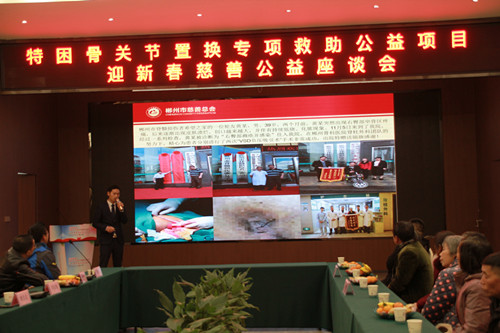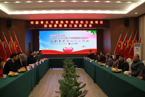 2019年1月23日,市慈善总会、郴州骨科医院联合举行特困骨关节置换救助公益项目展示暨受助代表迎新春座谈会。市慈善总会会长樊忠达、郴州骨科医院院长陈庆国出席座谈会并发表讲话,市慈善总会副会长秘书长李志刚、市慈善办主任喻应志、副会长邓德武、郴州骨科医院副院长马彪参加座谈会,受助代表以及部分医务人员参加座谈。
