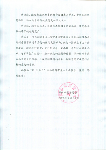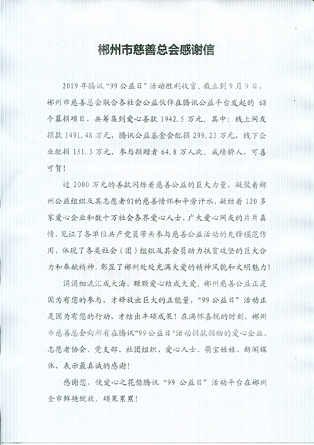 郴州市慈善总会感谢信