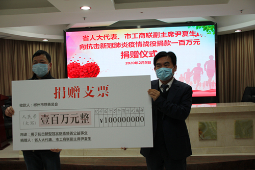 2020年2月5日,省人大代表、市工商联副主席、湖南省夏生实业有限公司有限公司董事长尹夏生,为郴州市抗击新型冠状病毒疫情阻击战,向郴州市慈善总会捐赠100万元,举行了简短的捐赠仪式。此前,尹夏生向嘉禾县人民政府捐赠100万元,向永兴县捐赠30万元,向相关社区、乡镇捐赠10万元,捐赠物资价值30万元,累计个人捐赠270万元。