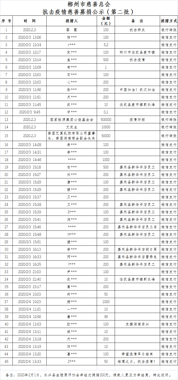 郴州市慈善总会抗击疫情慈善募捐公示(第二批)