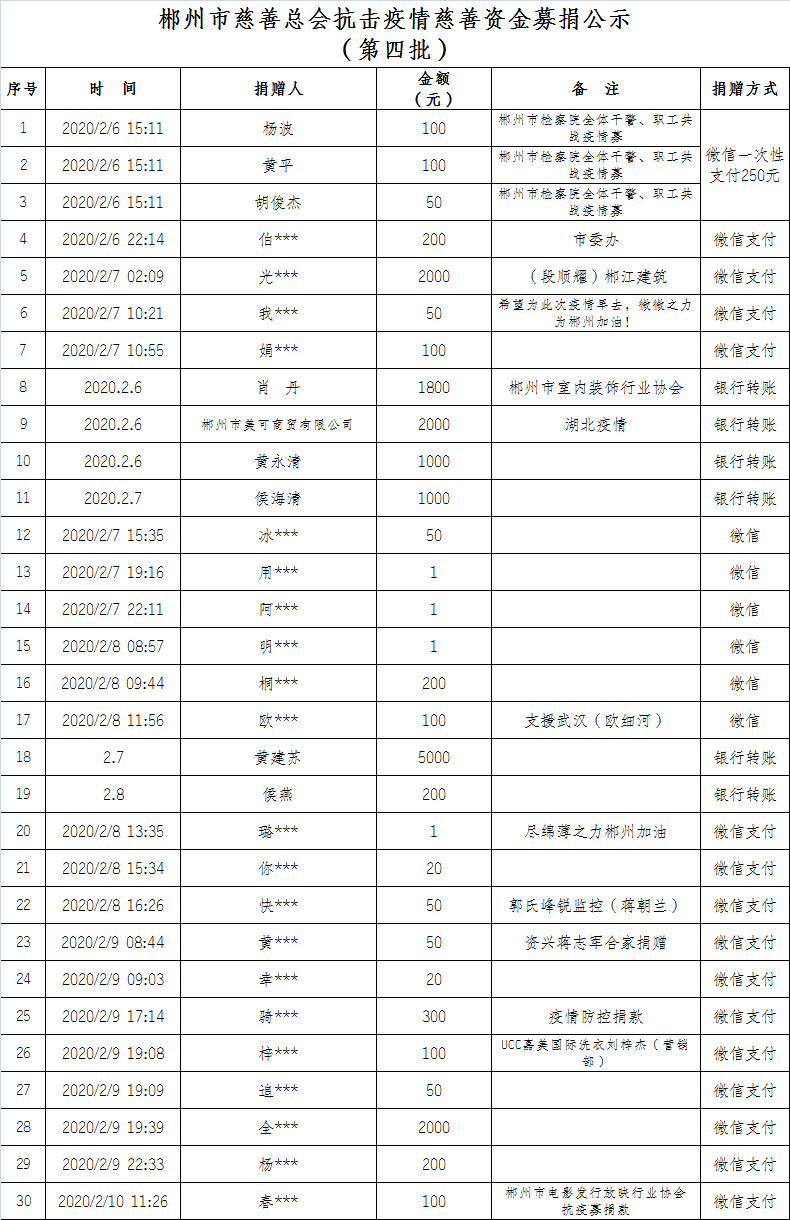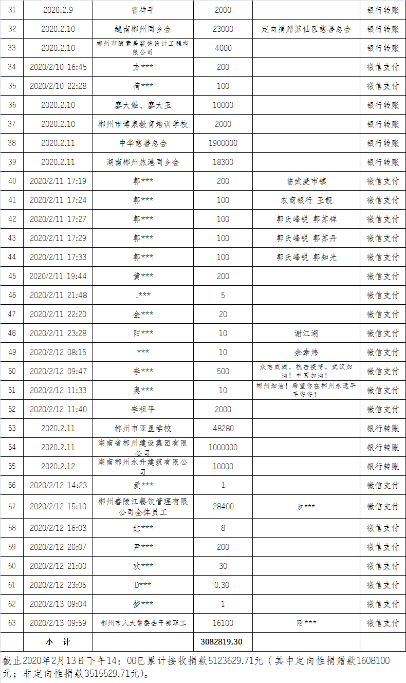 自新型冠状病毒感染肺炎疫情发生后,市慈善总会依据《中华人民共和国慈善法》及相关法律法规有关规定,认真按照市委、市政府的统一部署,依法依规开展慈善募捐活动。现将2020年2月6日14:00至2020年2月13日14:00接收慈善捐赠情况公示如下:
