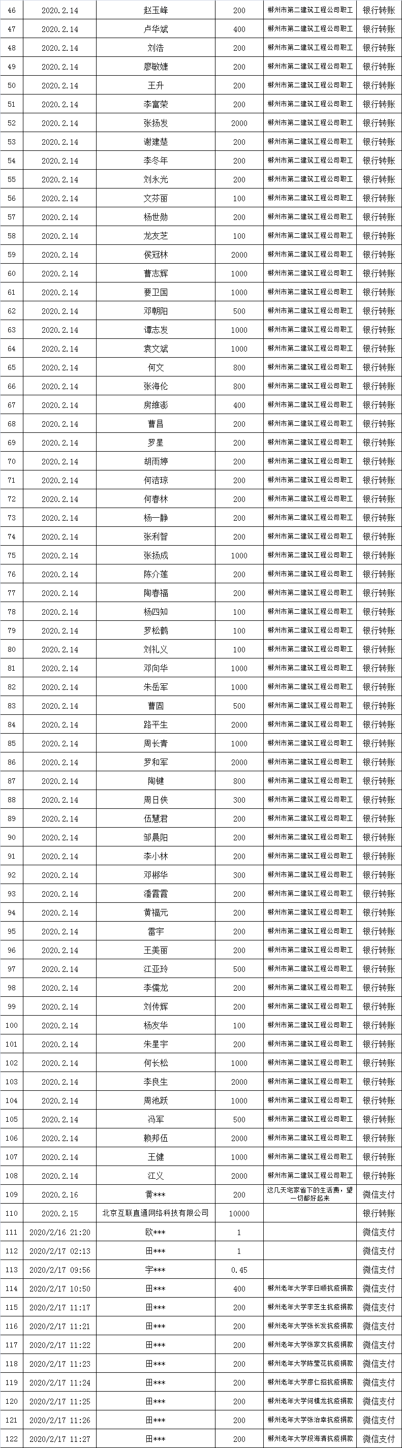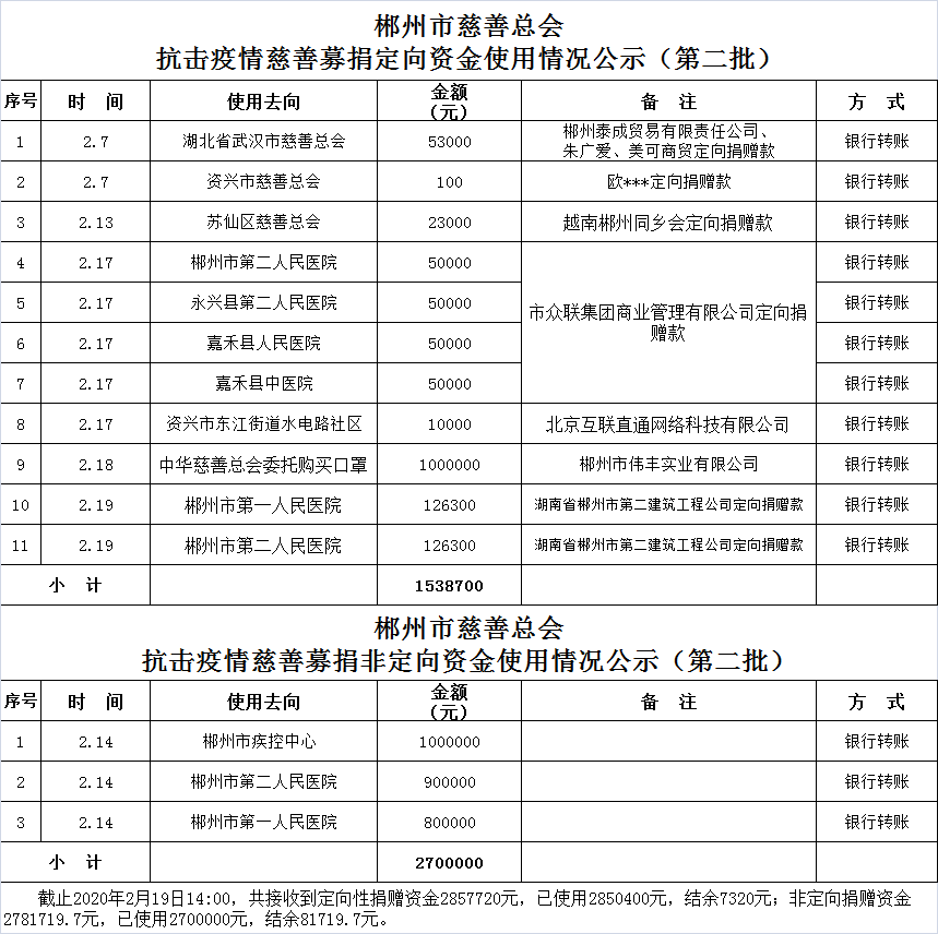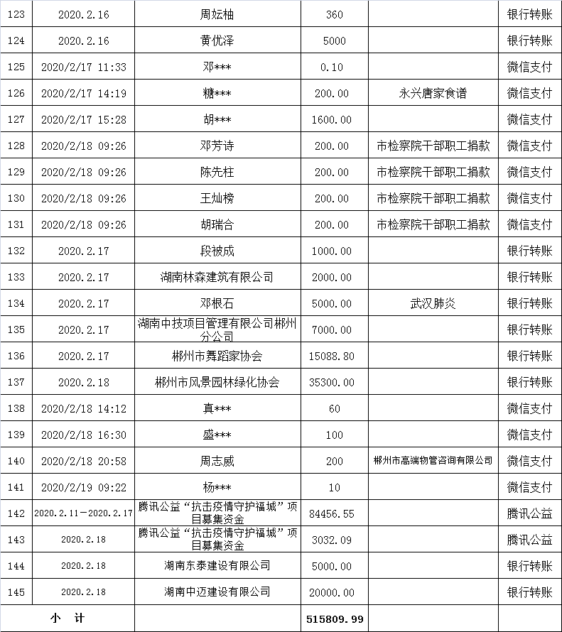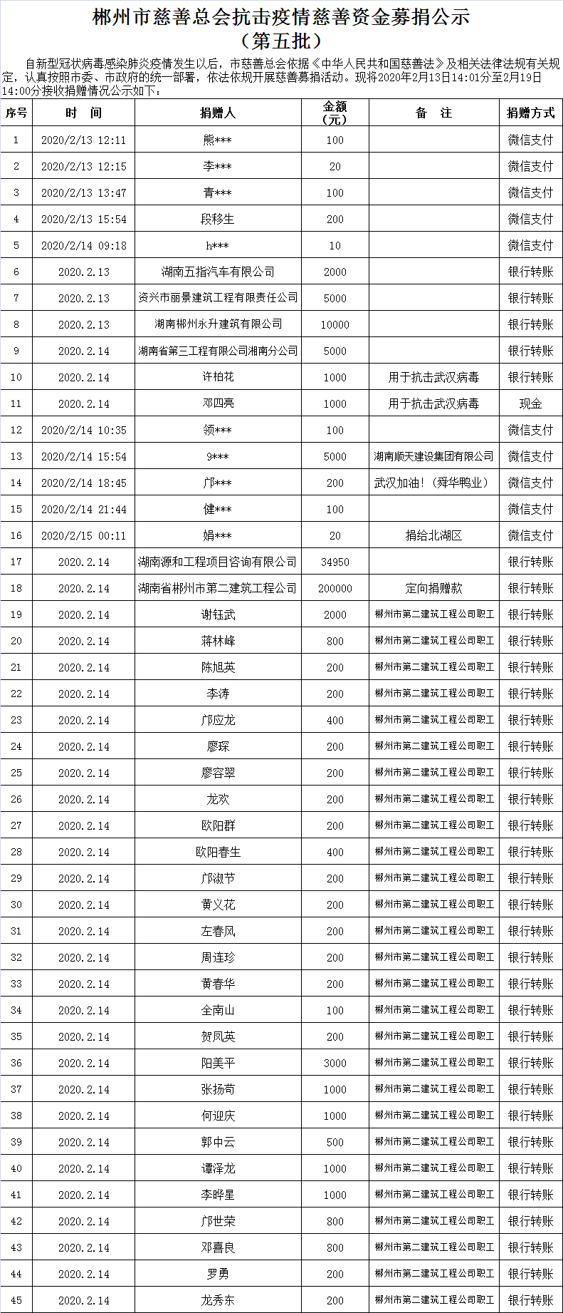 郴州市慈善总会抗击疫情慈善资金募捐公示(第五批)