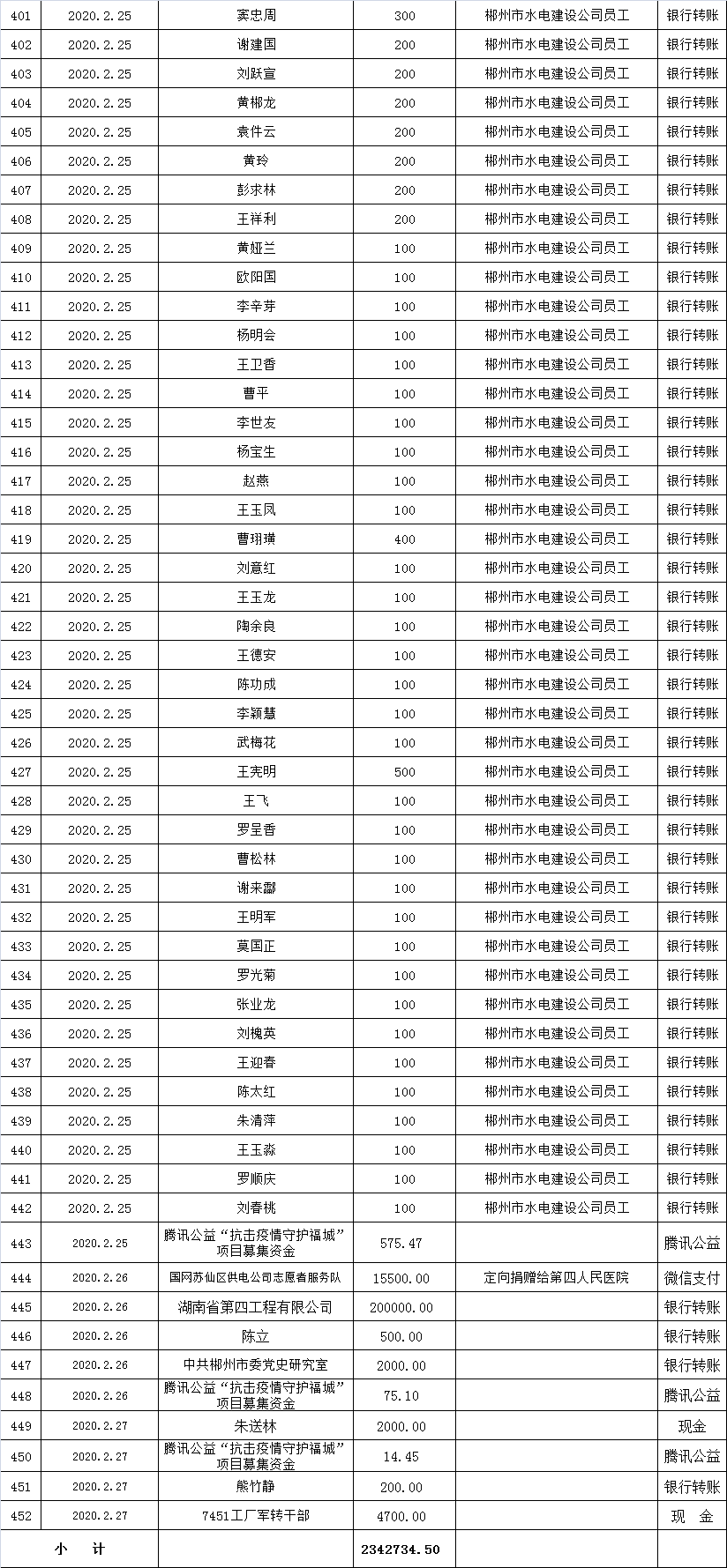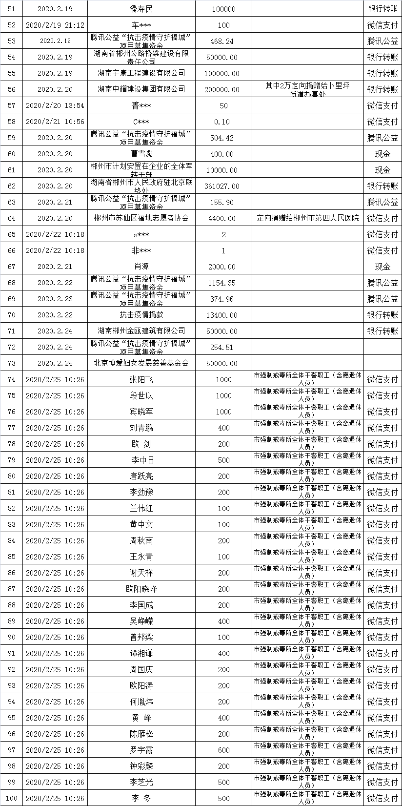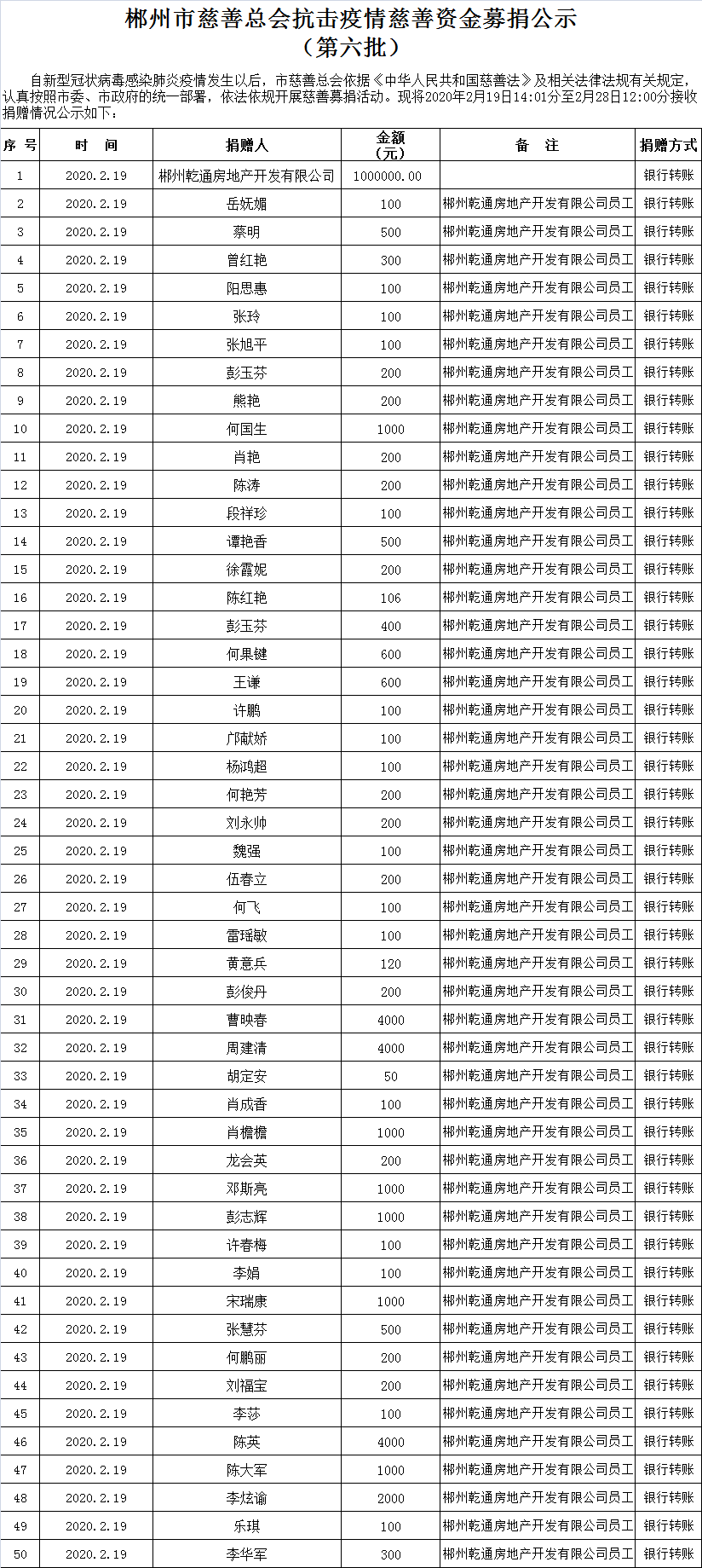 郴州市慈善总会抗击疫情慈善资金募捐公示(第六批)