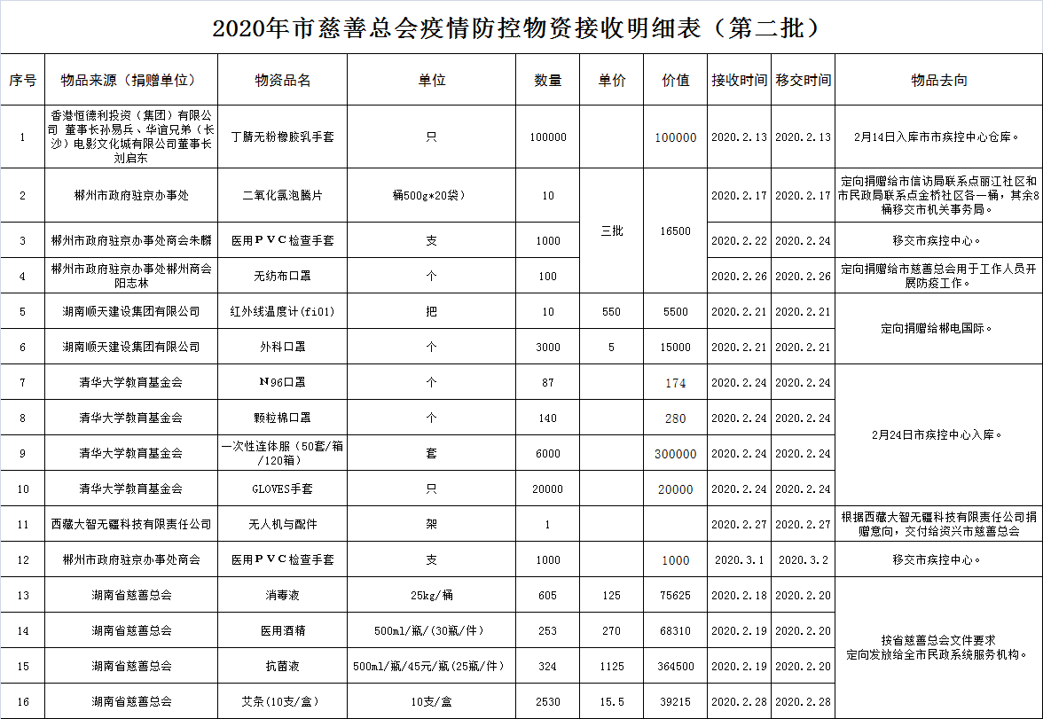 2020年市慈善总会接收新型肺炎疫情防控捐赠物资明细表(第二批)