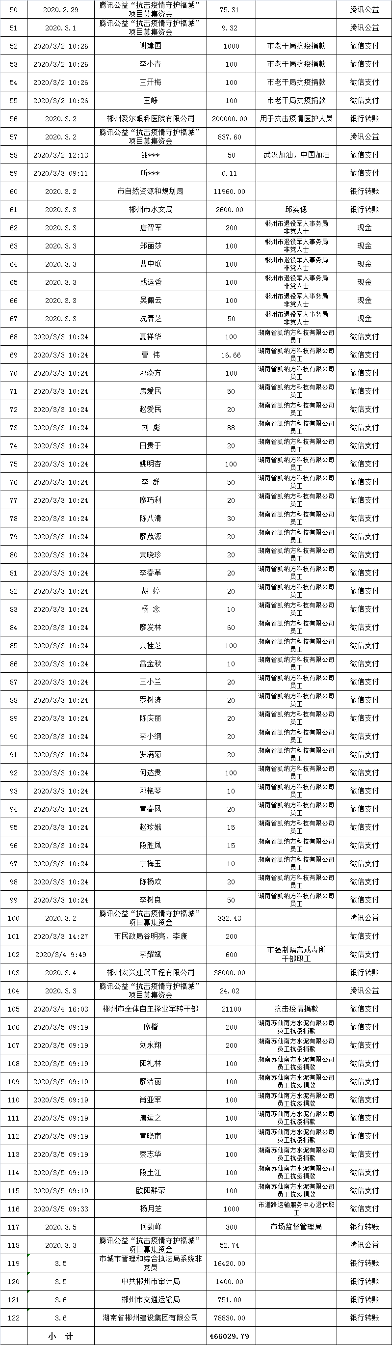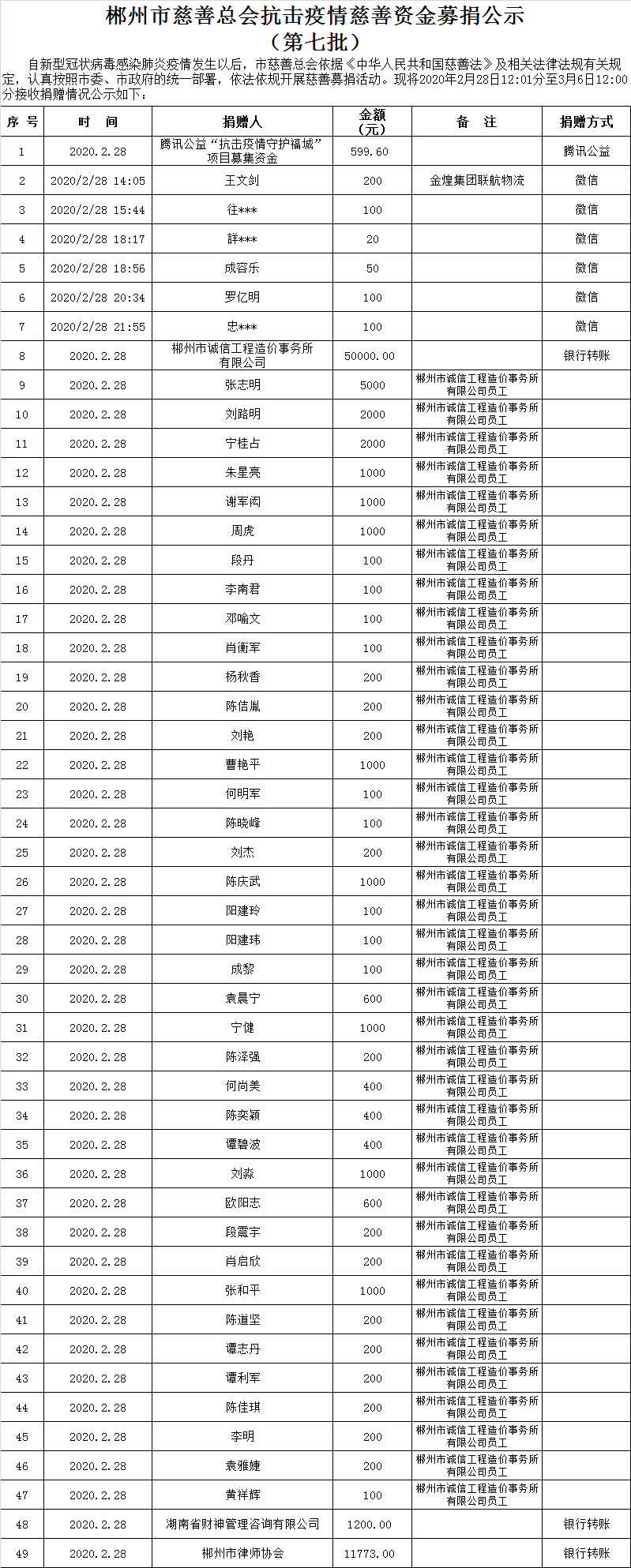 郴州市慈善总会抗击疫情慈善资金募捐公示(第七批)