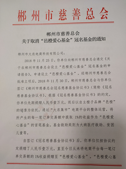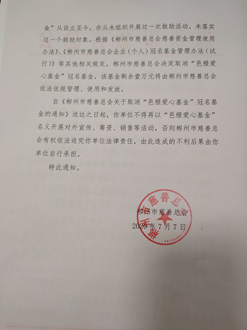 郴州市慈善总会关于取消“邑橙爱心基金”冠名基金的通知